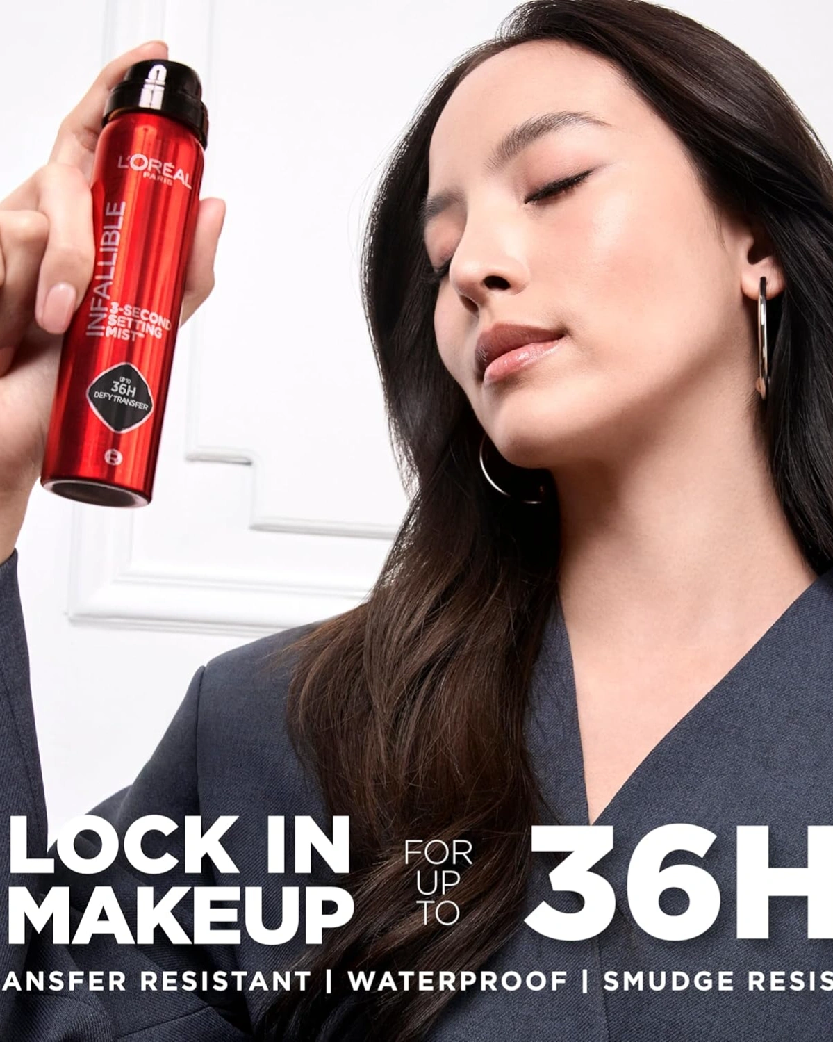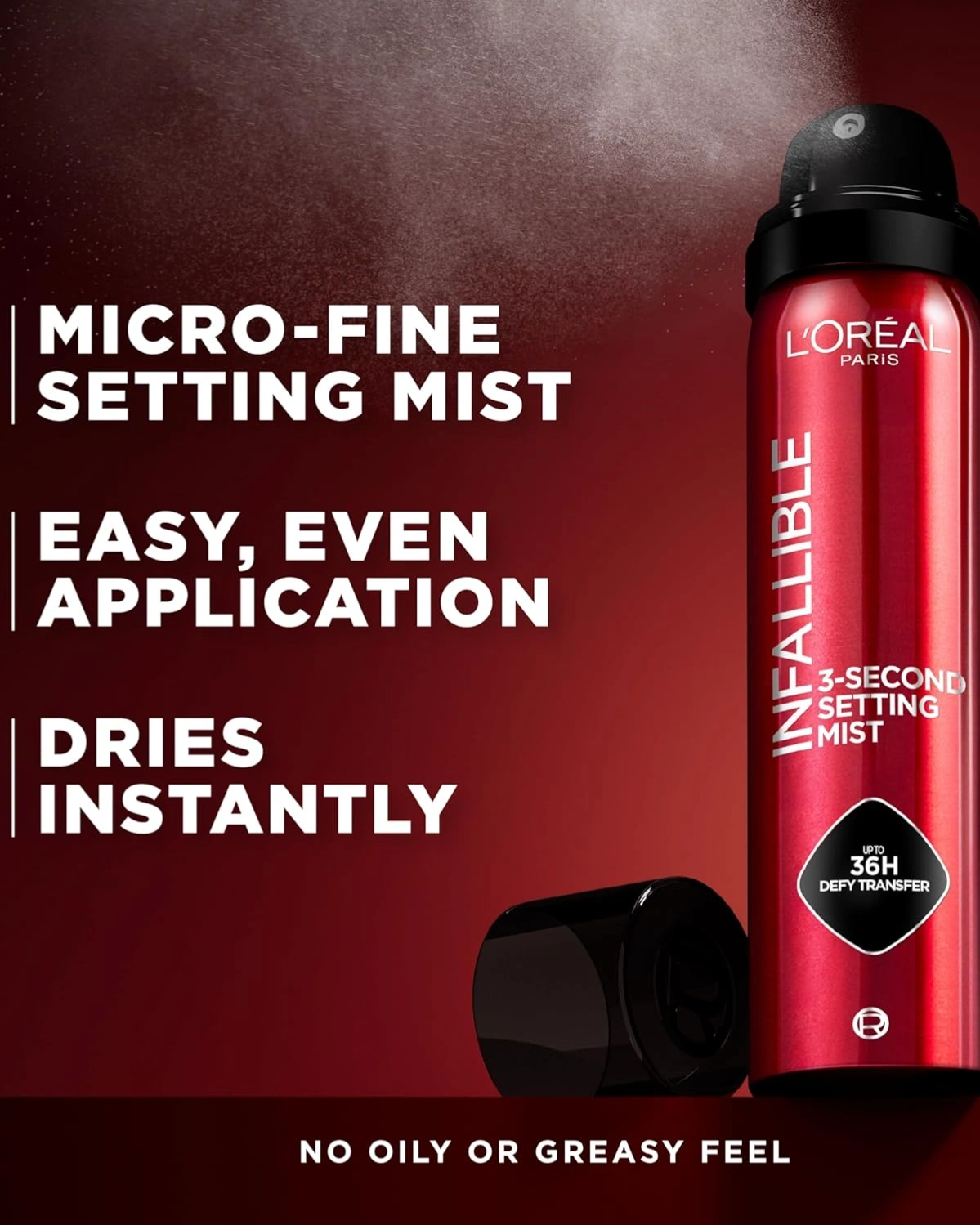 Lock In Makeup for up to 36 Hour Wear: Infallible 3-Second Makeup Setting Spray with microfine mist provides up to 36 hour wear in just one spray, for lip, eye and face makeup that is transfer, sweat and smudge-resistant all day.