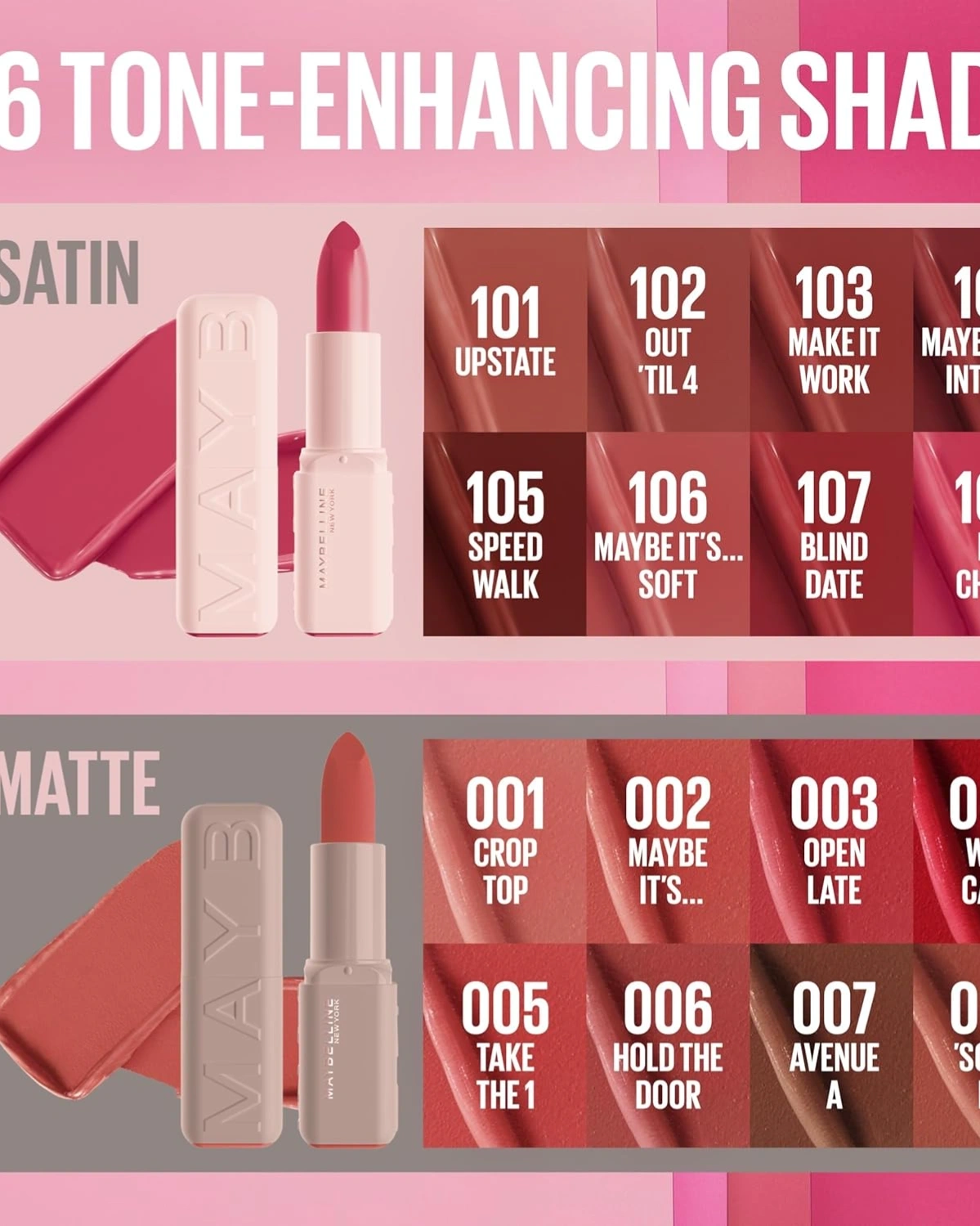 16 Flattering Lip Stick Shades: Find your shade with 16 flattering satin and matte lipstick finishes. From subtle everyday nude lipstick to bold pops of color, this Maybelline Lipstick range offers a diverse spectrum designed to be skin tone-enhancing