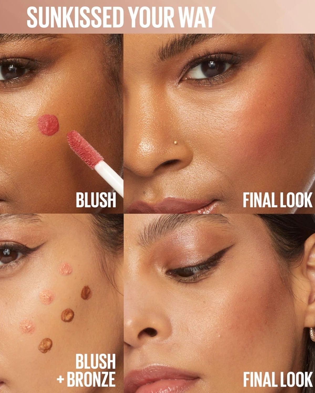 Instant Glowy, Sunkissed Cheeks: New Sunkisser Liquid Blush delivers blush and bronzer color with up to 12HR wear. This liquid blush for cheeks is available in 10 multi-use face makeup shades to deliver blushing color & bronzing warmth