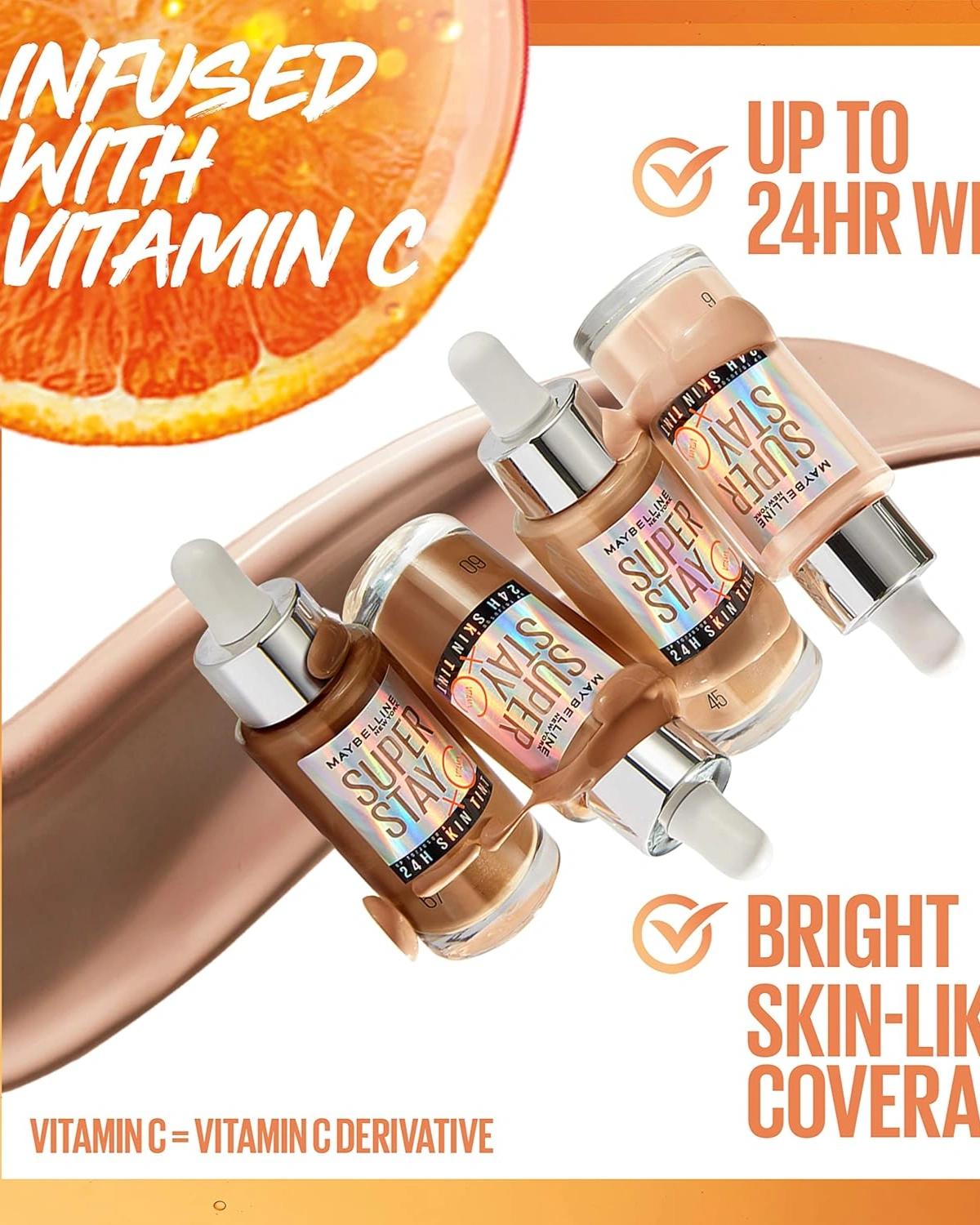 Super Stay Skin Tint: Introducing our 1st longwear skin tint with Vitamin C. Delivers bright, skin-like light-to-medium foundation makeup coverage. Weightless feeling face makeup, up to 24HR foundation makeup wear. Resists sweat, humidity and fading