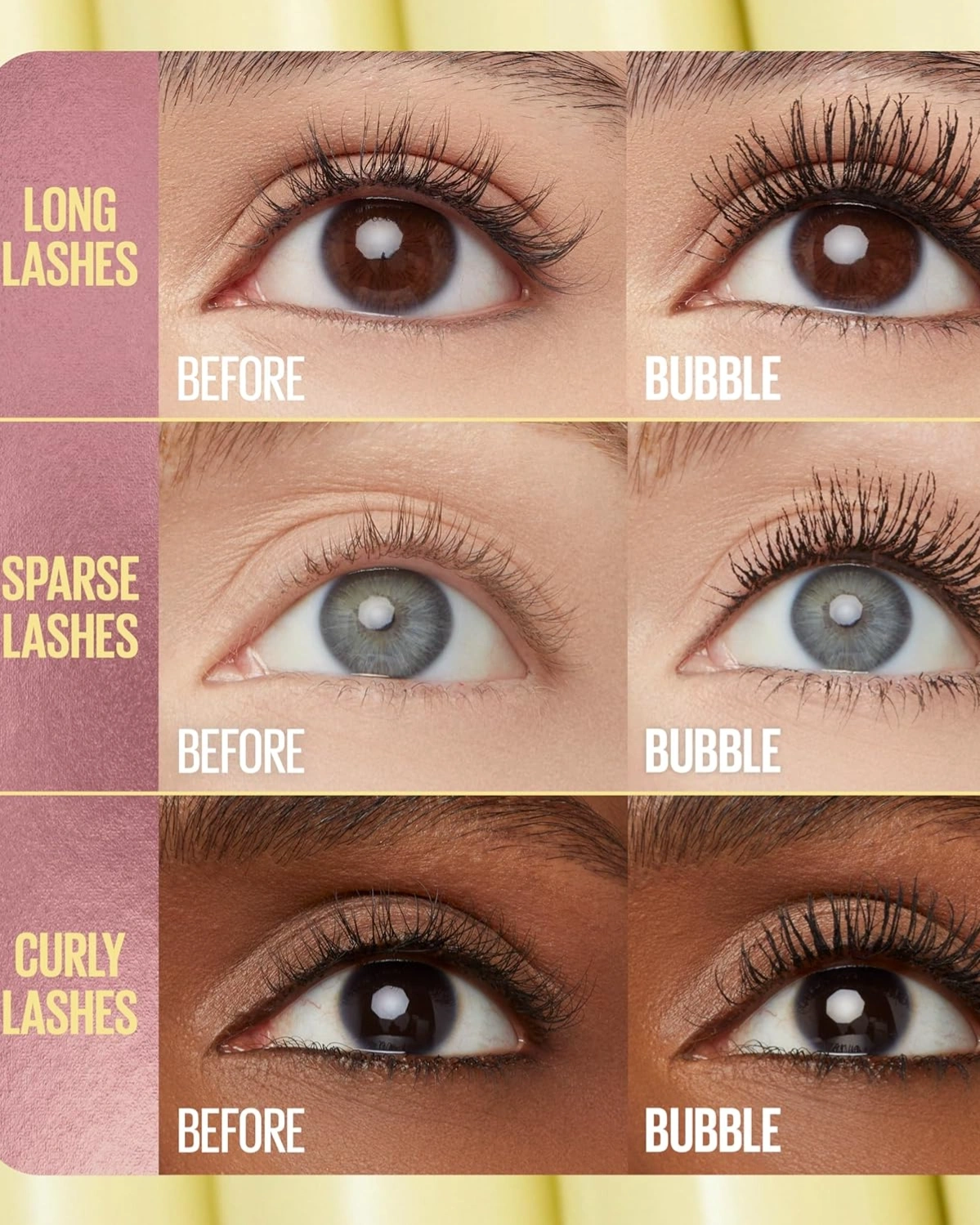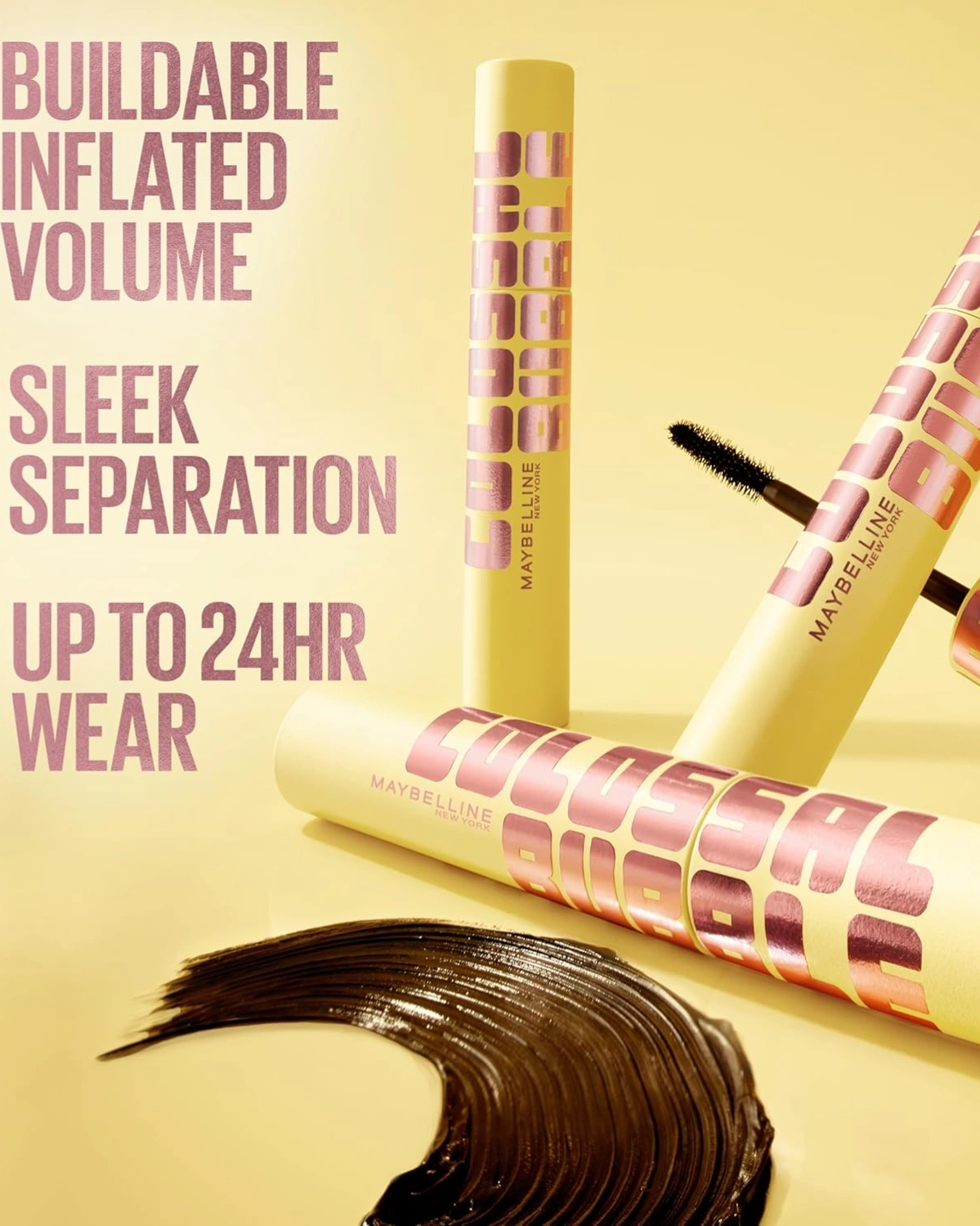 Bubble-Like Lash Look: Buildable, sleek volume bubbling up one lash at a time! Colossal Bubble Mascara allows you to inflate your lashes with bold impact in a New York minute. This long-lasting mascara leaves lashes looking separated & feeling light