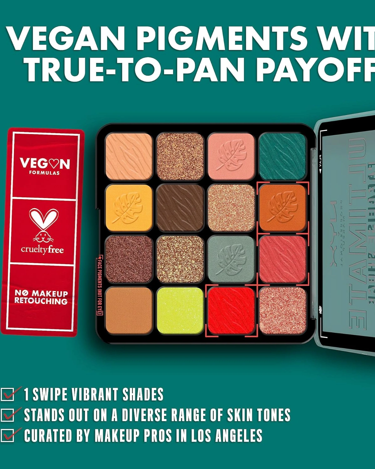 • Eyeshadow Palette: This professional level makeup palette features 16 vegan, pigmented shadows that glide onto lids and make eyes pop with color; Use with NYX Professional Makeup eyeshadow primer for bolder, longer lasting color