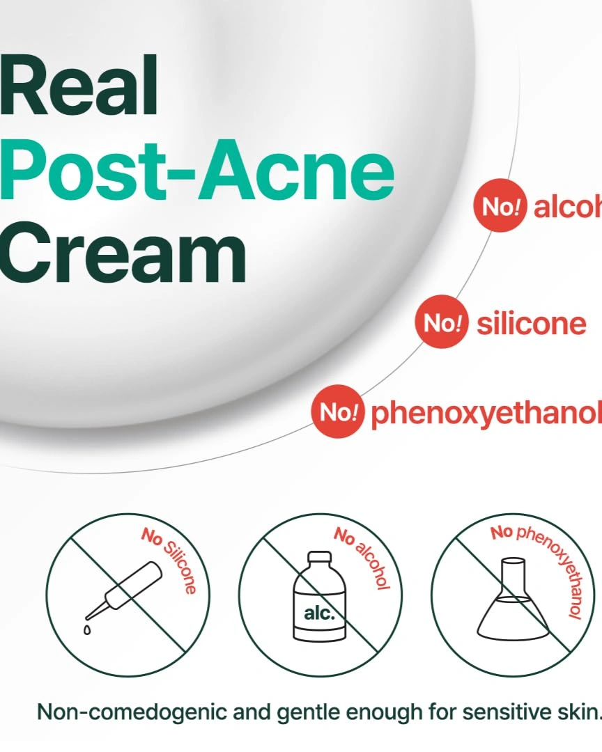 [ 'REAL' POST-ACNE CREAM – REAL ACNE SAFE FORMULA] Acne skin formula without harmful silicone, alcohol, or phenoxyethanol won't clog your pores.